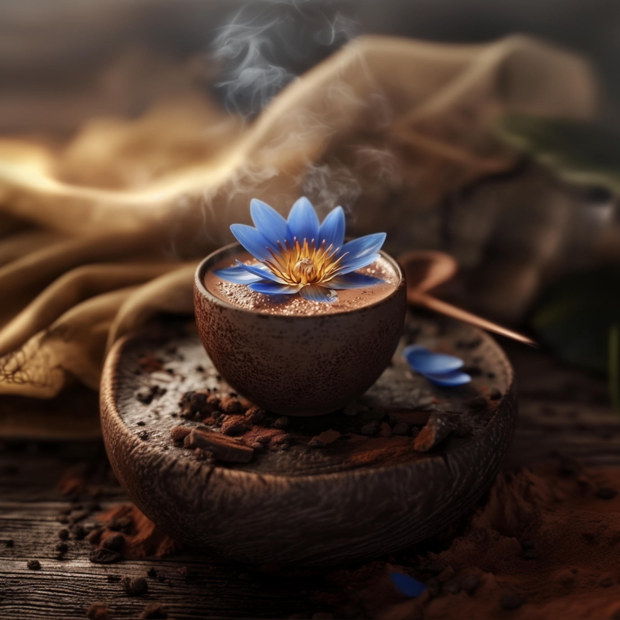 Organic stone-ground ceremonial cacao (Peru), Water Lily Lotus tea leaves, edible 24 K gold powder.